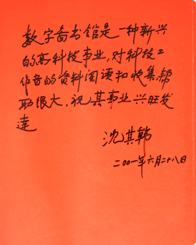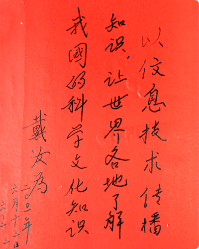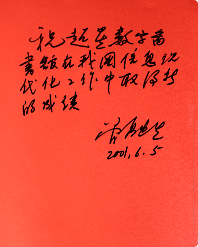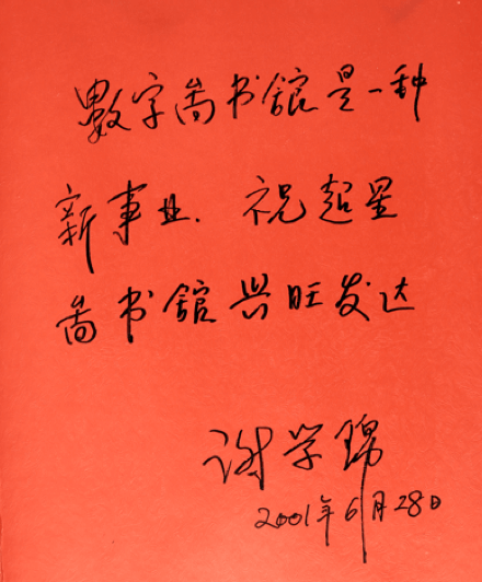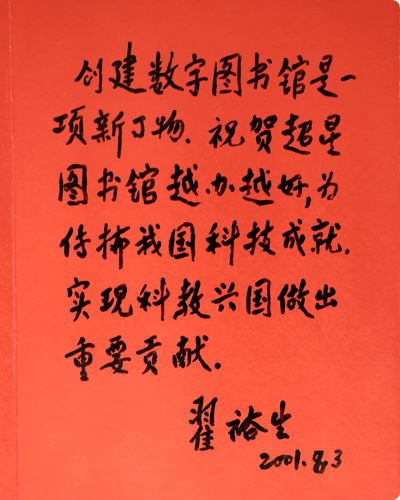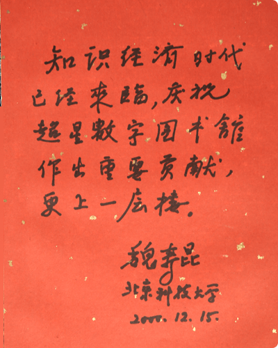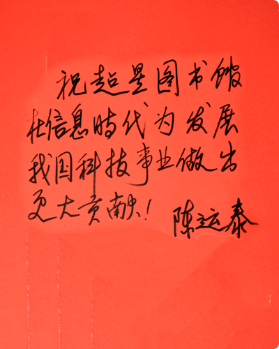 創建數字圖書館是一項新事物,祝賀超星圖書館越辦越好,為傳播我國科技成就,實現科教興國做出重要貢獻